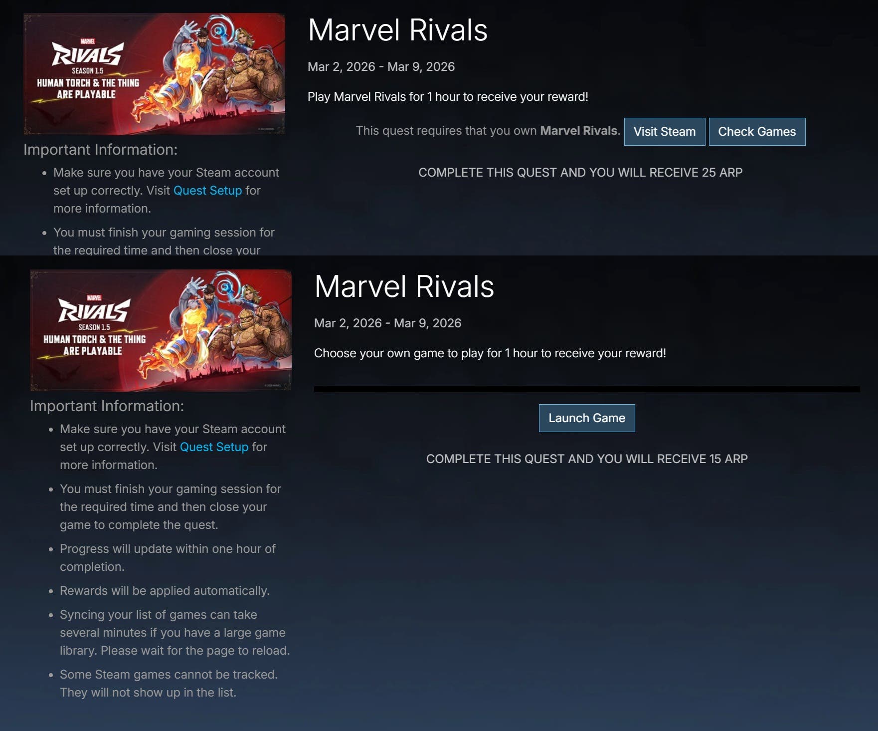 Is this week's Steam Quest broken for anyone else? I have Marvel Rivals installed - I've played it successfully in at least half a dozen other Steam Quests and changed nothing since, yet this week the Steam Quest page is suggesting I don't even have it installed and won't find it when I sync my games. But in the Choose Your Own game Steam Quest for this week, I can pick Marvel Rivals - so it does know I have it installed. Yet when I've played it for hours, it's shown no progress after a day.